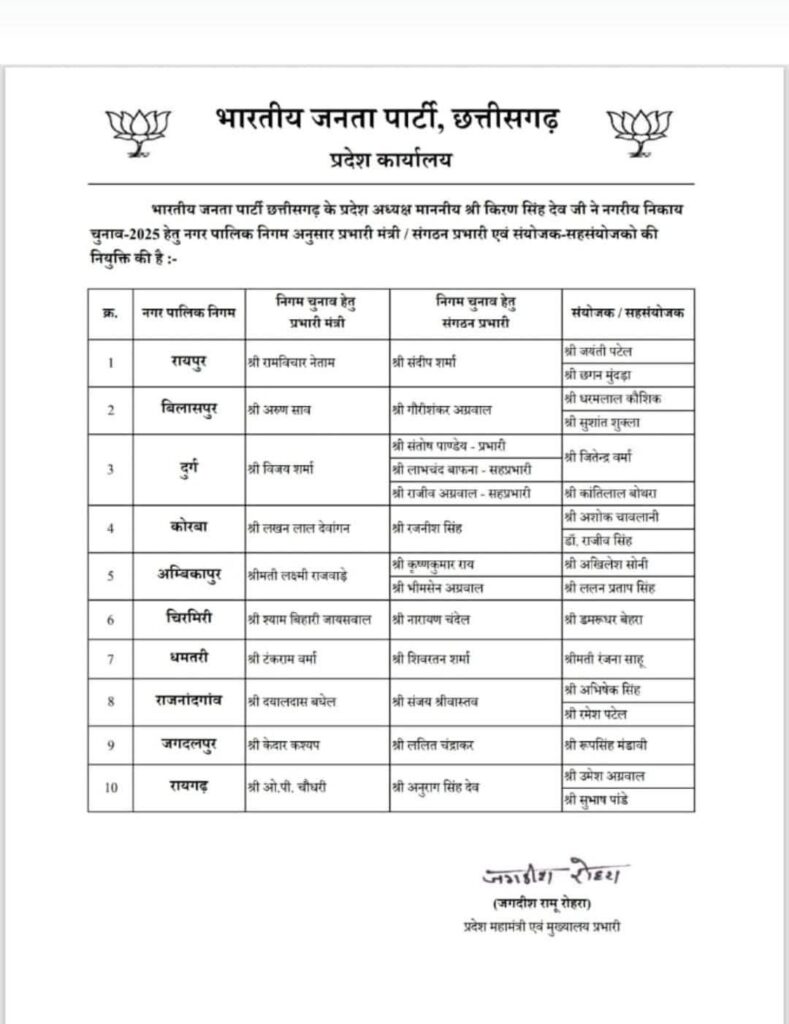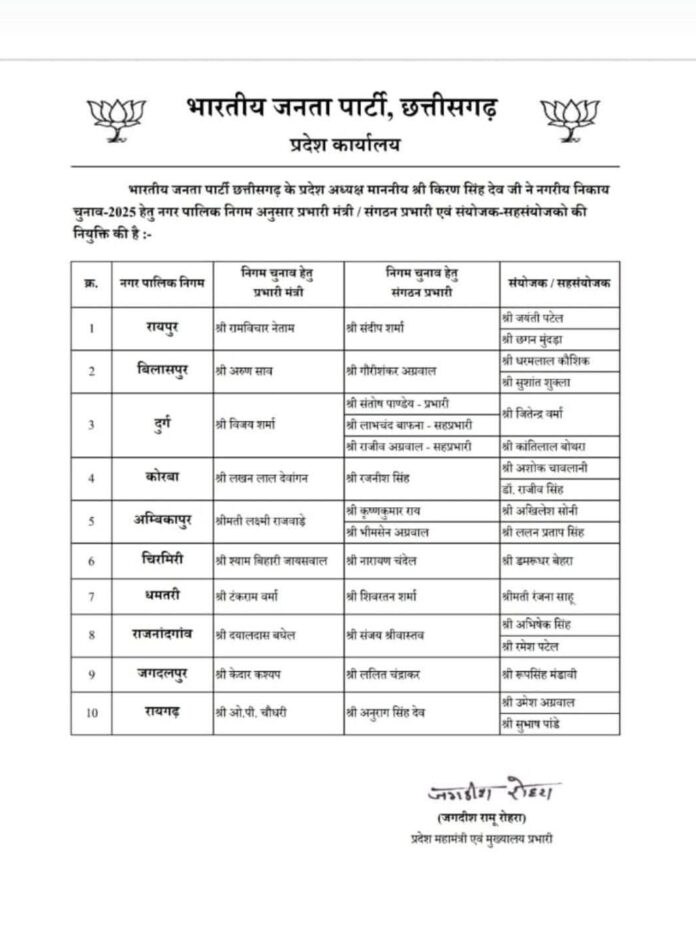 रायगढ़। भारतीय जनता पार्टी (भाजपा) ने आगामी रायगढ़ नगर निगम चुनाव के लिए अपनी चुनावी रणनीति को मजबूत बनाने के लिए प्रमुख पदाधिकारियों की घोषणा की है। पार्टी ने अनुभवी और कर्मठ नेताओं को विभिन्न जिम्मेदारियां सौंपी हैं।
