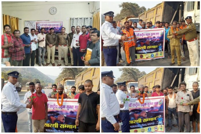 रायगढ़। रायगढ़ में राष्ट्रीय सड़क सुरक्षा माह के तहत 1 से 31 जनवरी तक विभिन्न जागरूकता और सम्मान कार्यक्रम आयोजित किए जा रहे हैं। इसी क्रम में आज रायगढ़ यातायात पुलिस ने ट्रैफिक नियमों का पालन करने वाले 163 वाहन चालकों को “सारथी सम्मान” देकर प्रोत्साहित किया। इस सम्मान का उद्देश्य ट्रैफिक नियमों का पालन करने वालों के आत्मविश्वास को बढ़ावा देना और अन्य लोगों को प्रेरित करना है।