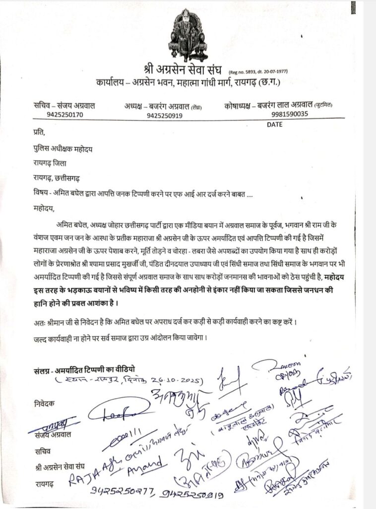महाराजा अग्रसेन पर आपत्तिजनक टिप्पणी से आक्रोशित हुआ अग्रवाल समाज: रायगढ़ में जताया विरोध, अमित बघेल पर एफआईआर की मांग…