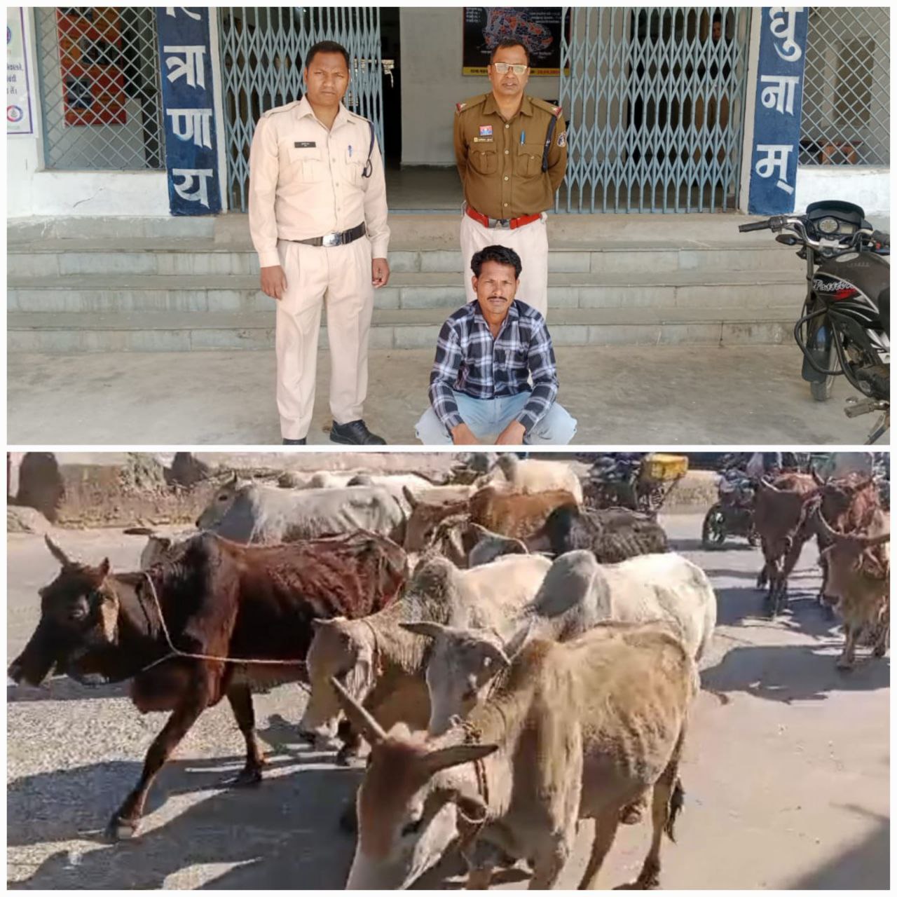 इसी क्रम में कल दिनांक 17 फरवरी की शाम थाना लैलूंगा पुलिस को मुखबिर से सूचना प्राप्त हुई कि आमापाली से झगरपुर मार्ग होते हुए मवेशियों को ओडिशा बूचड़खाने ले जाया जा रहा है। सूचना पर तत्परता पूर्वक कार्यवाही करते हुए पुलिस टीम द्वारा ग्राम झगरपुर के पास घेराबंदी कर मेन रोड पर मवेशी ले जा रहे एक युवक को पकड़ा गया।