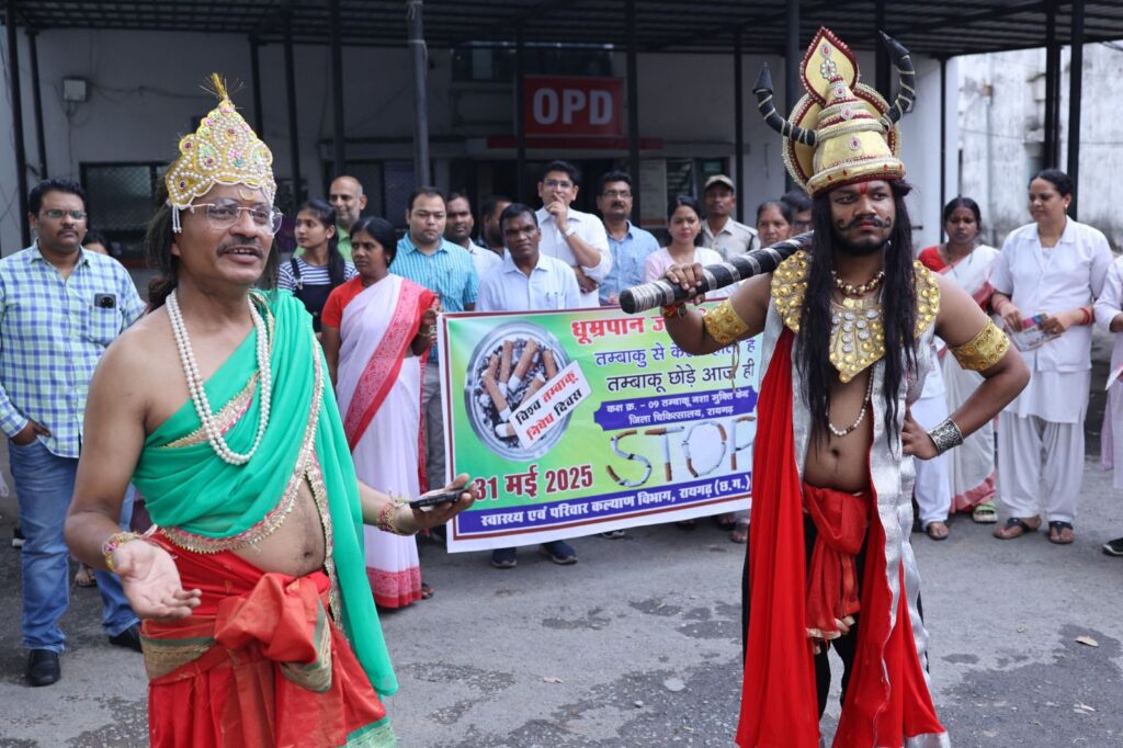 रायगढ़। राष्ट्रीय तम्बाकू निषेध दिवस के अवसर पर सीएमएचओ डॉ.अनिल कुमार जगत के मार्गदर्शन में आज प्रात: 10 बजे गजेन्द्र प्रसाद कला दल द्वारा रायगढ़ के केवड़ाबाड़ी बस स्टैण्ड एवं जिला चिकित्सालय के समीप नुक्कड़-नाटक का आयोजन किया गया। जिसमें तंबाकू सेवन से होने वाली बीमारियों और सामाजिक हानि को दर्शाया गया। साथ ही उपस्थित लोगों के बीच पाम्पलेट का भी वितरण किया गया। जिसमें तंबाकू के सेवन से होने वाले नुकसान और इससे बचाव के उपायों की जानकारी दी गई।
