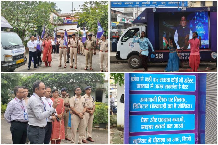 रायगढ़ । आज पुलिस अधीक्षक कार्यालय से पुलिस अधिकारियों और भारतीय स्टेट बैंक के वरिष्ठ अधिकारियों ने संयुक्त रूप से साइबर जागरूकता रथ को हरी झंडी दिखाकर शहर में रवाना किया। इस जागरूकता रथ के साथ नुक्कड़ नाटक करने वाले कलाकारों का दल भी मौजूद है, जो शहर के प्रमुख चौक-चौराहों पर लोगों को साइबर ठगी के तरीकों और उनसे बचाव की जानकारी देंगे।