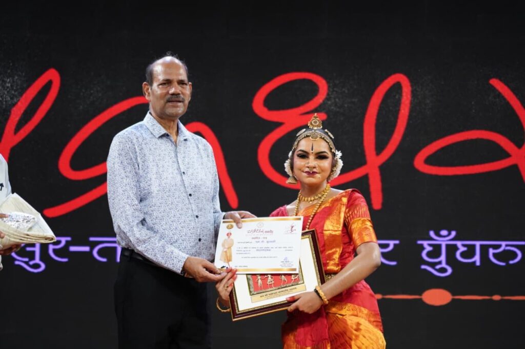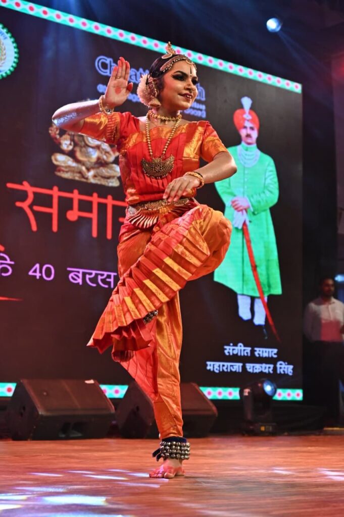रायगढ़/ अंतरराष्ट्रीय ख्याति प्राप्त चक्रधर समारोह के मंच पर दुर्ग से आयी भरतनाट्यम नृत्यांगना सुश्री एम.टी.मृन्मयी ने अपनी मनमोहक प्रस्तुति से दर्शकों को मंत्रमुग्ध कर दिया। प्रसिद्ध भरतनाट्यम आचार्य डॉ.जी.रतीश बाबू की सुपुत्री एवं शिष्या मृन्मयी ने अपनी साधना और अनुशासन से भरतनाट्यम की परंपरा को नई ऊँचाइयों तक पहुँचाया है। अब तक 1300 से अधिक मंचों पर एकल प्रस्तुतियाँ देकर उन्होंने शास्त्रीय नृत्य मंच पर अपनी विशिष्ट पहचान बनाई है।