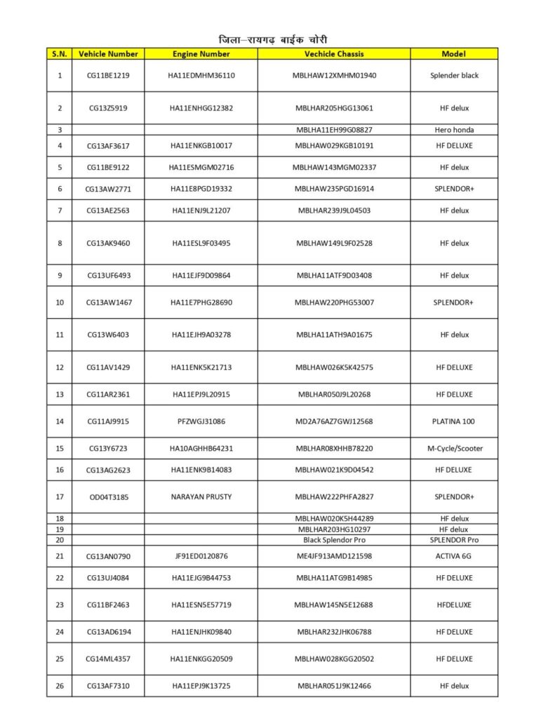 प्रारंभिक जांच में बरामद बाइक में 21 बाइक पर रायगढ़ जिले में एफआईआर दर्ज मिले तथा 2 बाइक पर जिला सक्ती और एक चोरी बाइक में जिला सारंगढ़ में एफआईआर दर्ज है ।