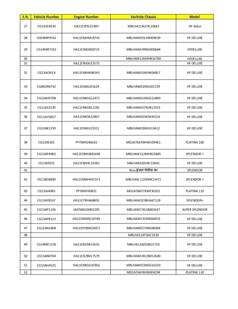 38 एफएच डिलक्स बाइक, 9 स्पेलेण्डर, 4 प्लेटिना और 1 एक्टिवा 6G स्कुटी