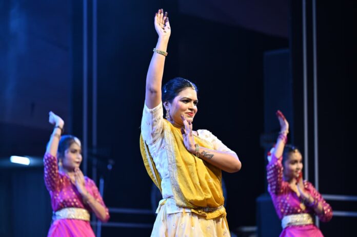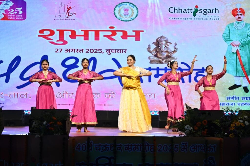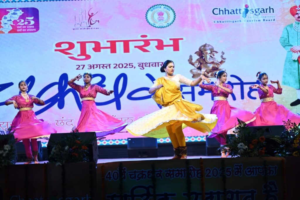 रायगढ़/ अंतरराष्ट्रीय ख्याति प्राप्त चक्रधर समारोह के दूसरे दिन स्थानीय कलाकारों ने अपनी प्रतिभा से दर्शकों का मन मोह लिया। इस अवसर पर रायगढ़ की सुविख्यात कथक नृत्यांगना पूजा जैन और उनकी टीम ने मनमोहक प्रस्तुति दी। कार्यक्रम की शुरुआत पंचदेव वंदना से हुई। इसके पश्चात उन्होंने जयपुर घराने के तोड़े-टुकड़े, लखनऊ घराने का तराना और ठुमरी प्रस्तुत कर दर्शकों को मंत्रमुग्ध कर दिया। ताल और लय की सुंदर संगति के साथ मंच पर सजीव हुई उनकी प्रस्तुतियों ने दर्शक दीर्घा में तालियों की गड़गड़ाहट गूंजा दी। पूजा जैन के साथ मंच पर उनकी टीम की प्रतिभाशाली सदस्याएँ कु. सौम्या साहू, कु. पाव्या श्रीवास्तव, कु. आसिता वर्मा और कु. वंशिका पात्रा भी शामिल रहीं, जिन्होंने अपने सधे हुए भाव और नृत्य कौशल से प्रस्तुति को और भी प्रभावशाली बना दिया।
