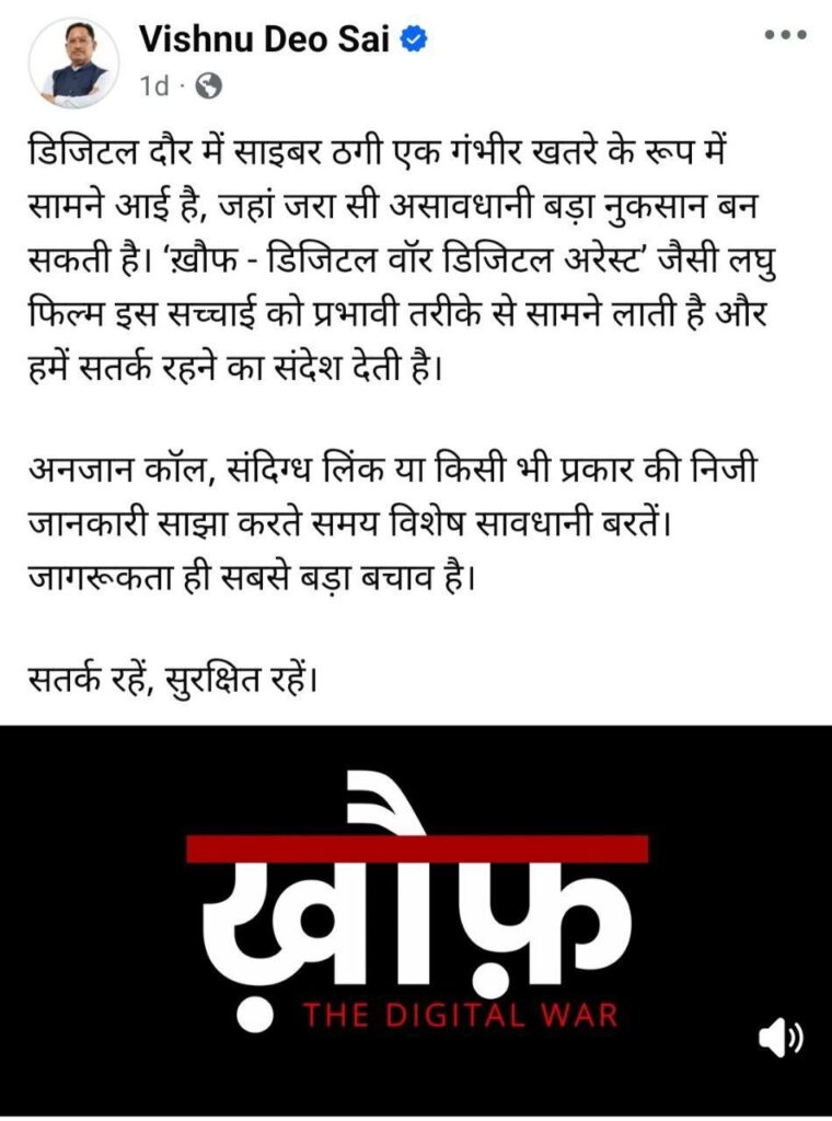 रायगढ़ । प्रदेश के मुख्यमंत्री विष्णुदेव साय ने साइबर फ्रॉड के प्रति जागरूकता फैलाने के उद्देश्य से वरिष्ठ पुलिस अधीक्षक रायगढ़ शशि मोहन सिंह द्वारा निर्मित एवं अभिनीत शॉर्ट फिल्म “खौफ- द डिजिटल वार” को अपने आधिकारिक फेसबुक पेज पर साझा करते हुए देशवासियों को सतर्क रहने का संदेश दिया है। मुख्यमंत्री ने अपने संदेश में फिल्म में डिजिटल अरेस्ट जैसे गंभीर विषय को प्रभावी ढंग से प्रस्तुत करने की सराहना करते हुए इसे समयानुकूल पहल बताया।