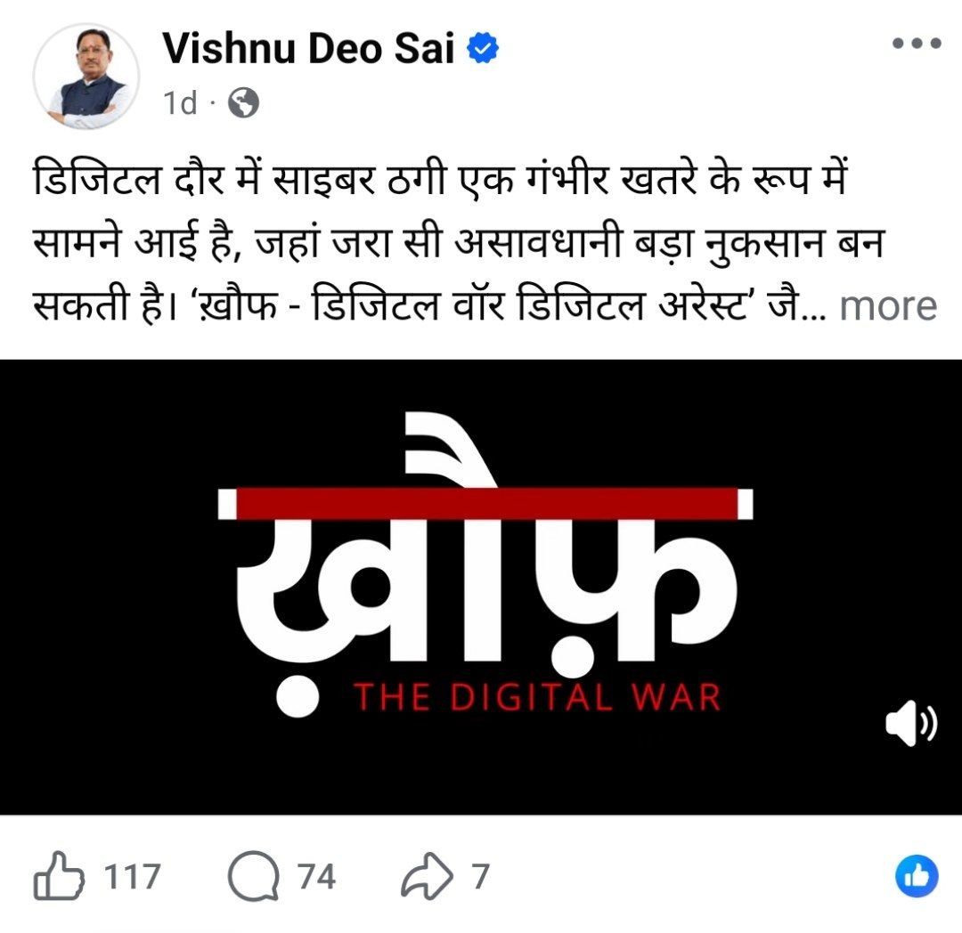 रायगढ़ । प्रदेश के मुख्यमंत्री विष्णुदेव साय ने साइबर फ्रॉड के प्रति जागरूकता फैलाने के उद्देश्य से वरिष्ठ पुलिस अधीक्षक रायगढ़ शशि मोहन सिंह द्वारा निर्मित एवं अभिनीत शॉर्ट फिल्म “खौफ- द डिजिटल वार” को अपने आधिकारिक फेसबुक पेज पर साझा करते हुए देशवासियों को सतर्क रहने का संदेश दिया है। मुख्यमंत्री ने अपने संदेश में फिल्म में डिजिटल अरेस्ट जैसे गंभीर विषय को प्रभावी ढंग से प्रस्तुत करने की सराहना करते हुए इसे समयानुकूल पहल बताया।