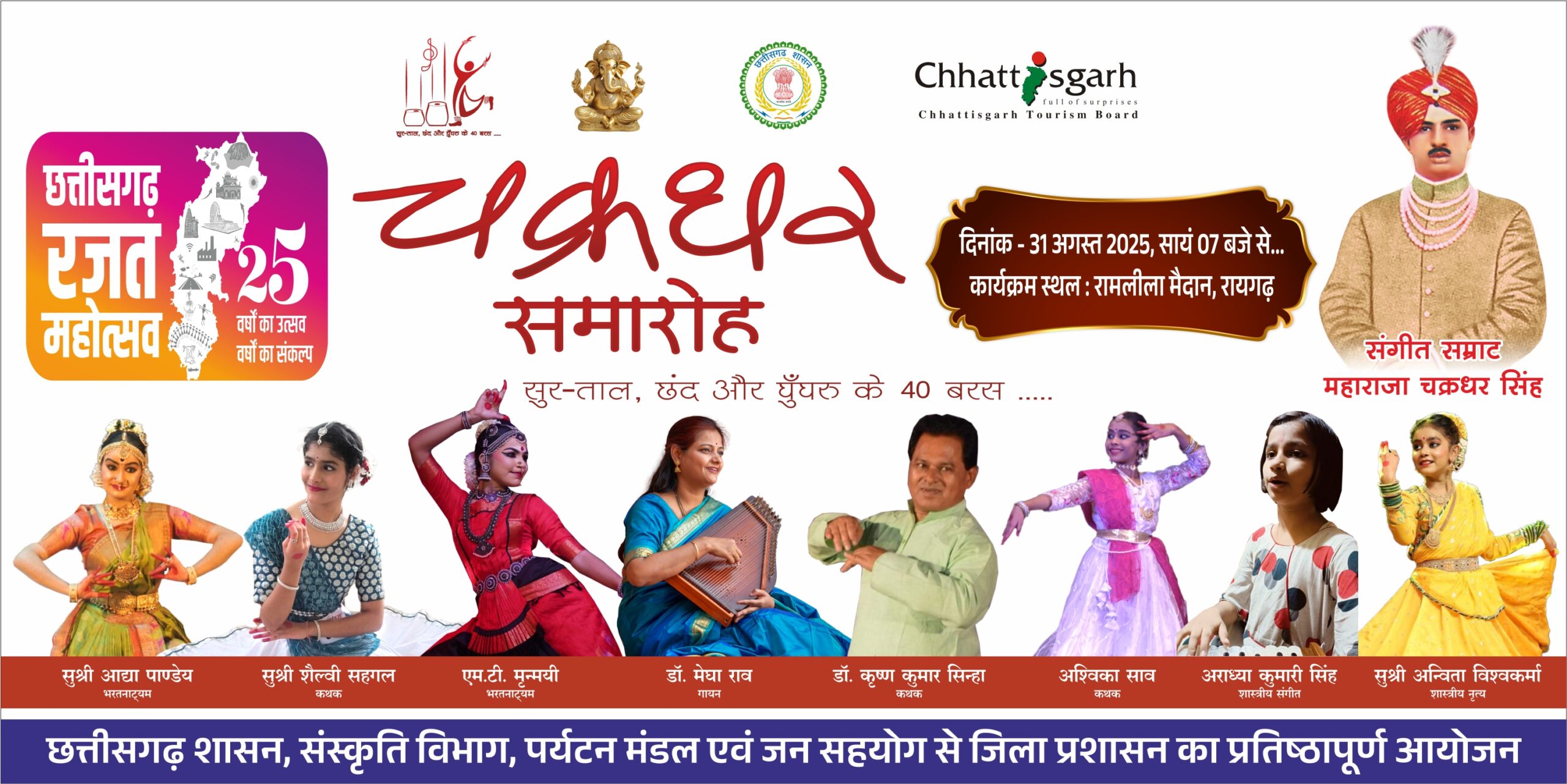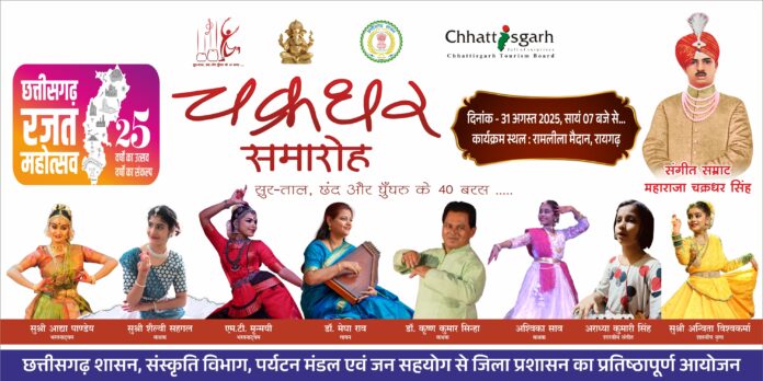 रायगढ़। 40 वें चक्रधर समारोह के पांचवें दिन 31 अगस्त को शास्त्रीय गायन, कथक, भरतनाट्यम, क्लासिकल डांस एवं गायन की प्रस्तुति होगी। जिसमें रायगढ़ की सुश्री आराध्या कुमारी सिंह शास्त्रीय गायन प्रस्तुत करेंगी। इसी तरह कार्यक्रम में कोरबा की सुश्री अश्विका साव द्वारा कथक, भिलाई की सुश्री आद्या पाण्डेय द्वारा भरतनाट्यम, रायगढ़ की सुश्री शैल्वी सहगल कथक पर अपनी प्रस्तुति देंगी। कार्यक्रम की अगली कड़ी में सुश्री अन्विता विश्वकर्मा रायपुर क्लासिकल डांस प्रस्तुत करेंगी। वहीं दुर्ग की सुश्री एम.टी.मृन्मयी द्वारा भरतनाटयम, डॉ.कृष्ण कुमार सिन्हा राजनांदगांव द्वारा कथक एवं पुणे की डॉ.मेघा राव गायन पर अपनी प्रस्तुति देंगी।