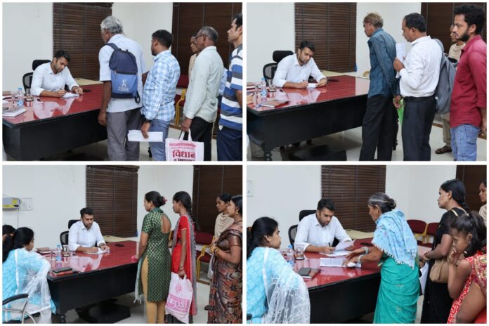 रायगढ़। कलेक्टर मयंक चतुर्वेदी ने कलेक्टर चेम्बर-प्रतीक्षा कक्ष मेंं आयोजित साप्ताहिक जनदर्शन कार्यक्रम में सभी जिला स्तरीय अधिकारियों की उपस्थिति में बारी-बारी से जिले के आवेदकों की समस्याओं को गंभीरतापूर्वक सुनते हुए संबंधित अधिकारियों को प्राप्त आवेदनों को शीघ्र निराकरण करने के निर्देश दिए। जनदर्शन में आज जिले के विभिन्न क्षेत्रों से आये आवेदकों ने अपनी समस्याओं, मांगों और शिकायतों से संबंधित आवेदन प्रस्तुत किए। इस अवसर पर सहायक कलेक्टर श्री अक्षय डोसी तथा डिप्टी कलेक्टर श्रीमती रेखा चन्द्रा उपस्थित रही।