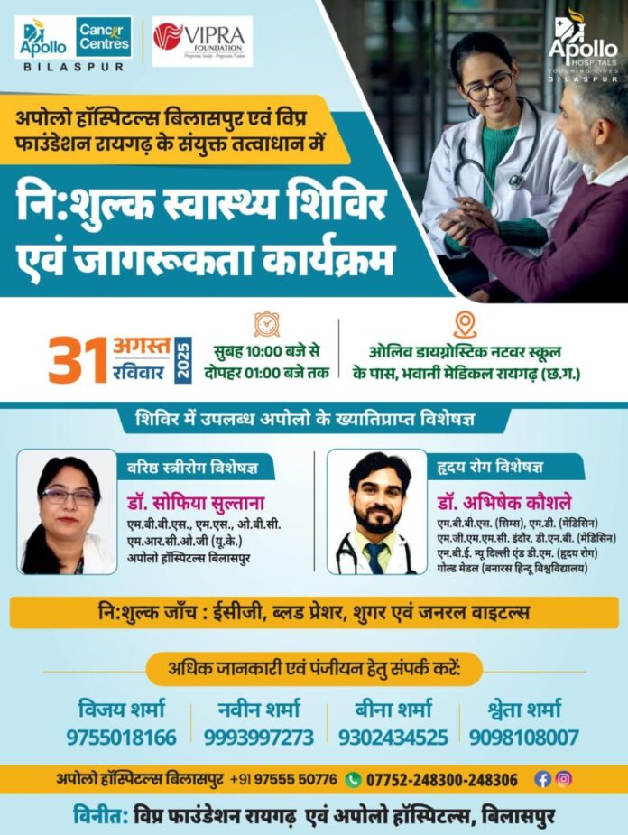 रायगढ़। स्वास्थ्य सेवाओं को लोगों तक पहुँचाने और आम नागरिकों में जागरूकता बढ़ाने के उद्देश्य से विप्र फाउंडेशन रायगढ़ एवं अपोलो हॉस्पिटल्स बिलासपुर के संयुक्त तत्वावधान में आगामी 31 अगस्त, रविवार को निःशुल्क स्वास्थ्य शिविर एवं जागरूकता कार्यक्रम का आयोजन किया जा रहा है।