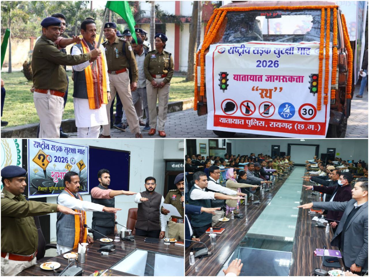 रायगढ़ / जिला कलेक्टोरेट स्थित सृजन सभाकक्ष में राष्ट्रीय सड़क सुरक्षा माह एवं महिला सुरक्षा जन-जागरूकता अभियान का भव्य शुभारंभ किया गया। इस अवसर पर राज्यसभा सांसद देवेंद्र प्रताप सिंह, कलेक्टर मयंक चतुर्वेदी एवं पुलिस अधीक्षक दिव्यांग पटेल द्वारा संयुक्त रूप से जागरूकता वाहन को हरी झंडी दिखाकर रवाना किया गया। राष्ट्रीय सड़क सुरक्षा माह 31 जनवरी तक मनाया जाएगा, जिसका उद्देश्य सड़क दुर्घटनाओं में कमी लाना, नागरिकों में यातायात नियमों के प्रति जागरूकता बढ़ाना तथा सुरक्षित एवं जिम्मेदार ड्राइविंग को प्रोत्साहित करना है। वहीं राज्य स्थापना की रजत जयंती के अवसर पर आयोजित 11 दिवसीय महिला सुरक्षा जन-जागरूकता अभियान के माध्यम से महिलाओं को उनके अधिकारों, कानूनी सुरक्षा, पुलिस सहायता, शिक्षा, डिजिटल सुरक्षा, स्वास्थ्य, परामर्श सेवाओं, कौशल विकास एवं सामुदायिक सहभागिता के प्रति जागरूक करना है।
