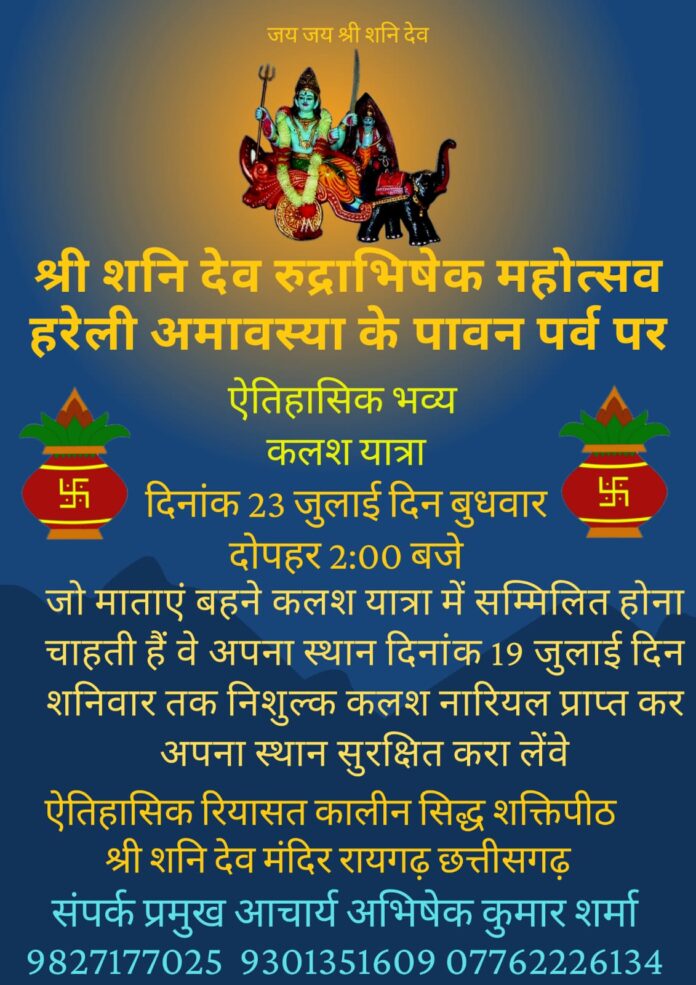 रायगढ़। हर वर्ष की तरह इस बार भी हरेली अमावस्या का पावन पर्व रायगढ़वासियों के लिए एक विशेष आध्यात्मिक अवसर लेकर आ रहा है। इस शुभ दिन पर श्री शनि देव रुद्राभिषेक महोत्सव का आयोजन एतिहासिक रियासत कालीन सिद्ध शक्तिपीठ श्री शनि देव मंदिर, रायगढ़ में बड़े ही धूमधाम से किया जाएगा।