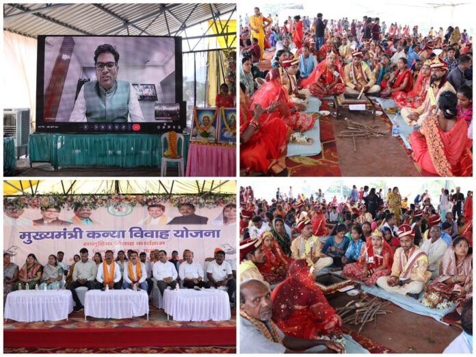 रायगढ़। मुख्यमंत्री सामूहिक कन्या विवाह योजना अंतर्गत आज महिला एवं बाल विकास विभाग द्वारा कृषि उपज मंडी पटेलपाली, रायगढ़ में सामूहिक कन्या विवाह कार्यक्रम का आयोजन किया गया। जिसमें मुख्य अतिथि के रूप में वित्त मंत्री ओ.पी.चौधरी वीडियो कॉन्फ्रेंसिंग के माध्यम जुड़े रहे। वित्त मंत्री ओ.पी.चौधरी ने सभी नवविवाहित 58 जोड़ों को दाम्पत्य जीवन में प्रवेश के लिए बधाई और शुभकामनाएं दी। उन्होंने गायत्री परिवार शाखा रायगढ़ को सामूहिक विवाह कार्यक्रम में सहयोग के लिए धन्यवाद दिया।