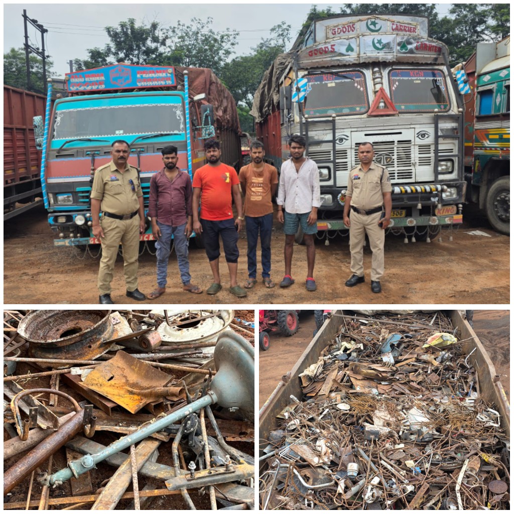 रायगढ़- पुलिस अधीक्षक दिव्यांग कुमार पटेल के दिशा निर्देशन और डीएसपी सुशांतो बनर्जी के मार्गदर्शन पर पूंजीपथरा थाना पुलिस ने अवैध कबाड़ परिवहन पर बड़ी कार्रवाई करते हुए कल सुबह दो 12 चक्का ट्रक और दो माजदा वाहन से भारी मात्रा में लोहे का स्क्रैप जप्त किया है। थाना प्रभारी निरीक्षक राकेश मिश्रा के नेतृत्व में सालासर चौक गेरवानी और सामारूमा मंदिर के पास सड़क पर घेराबंदी कर यह कार्रवाई की गई। पकड़े गए वाहनों में करीब 49.44 टन लोहे का स्क्रैप भरा हुआ था, जिसकी अनुमानित कीमत 13 लाख 76 हजार रुपए आंकी गई है।