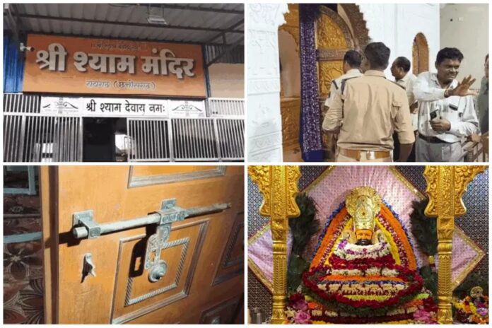 रायगढ़ शहर के हृदयस्थल में स्थित प्रसिद्ध श्री श्याम मंदिर में बीती रात चोरी की एक बड़ी और चौंकाने वाली घटना सामने आई है। अज्ञात चोरों ने मंदिर के मेन गेट का ताला तोड़कर भीतर प्रवेश किया और भगवान श्याम का कीमती मुकुट, चांदी की छतरी, सोने का हार और दो दानपेटियों से नकदी चुरा ली। चोरी गए सामान की कुल कीमत 10 लाख रुपये से अधिक बताई जा रही है।