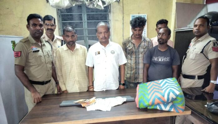 जानकारी के अनुसार, 14 अक्टूबर की शाम थाना प्रभारी जूटमिल निरीक्षक प्रशांत राव को मुखबिर से सूचना मिली कि ग्राम सांगीतराई डीपापारा आम रोड के किनारे कुछ लोग ताश पत्तियों से रुपये-पैसे का दांव लगाकर सार्वजनिक स्थान पर जुआ खेल रहे हैं। सूचना पर जूटमिल पुलिस टीम ने योजनाबद्ध तरीके से घेराबंदी कर रेड की कार्रवाई की, जिसमें पांच जुआरी पकड़े गए—(1) दिवाकर वैष्णव पिता कृष्णदास वैष्णव उम्र 33 वर्ष निवासी छातामुड़ा नाका, (2) मानस कर्मकार पिता स्व. सपन कर्मकार उम्र 47 वर्ष निवासी कबीर चौक, (3) जितेन्द्र कुमार माली पिता स्व. भृगु माली उम्र 35 वर्ष निवासी फटहामुड़ा, (4) आकाश महंत पिता रमेश महंत उम्र 22 वर्ष निवासी सांगीतराई महंतपारा, और (5) राजेश मांझी पिता स्व. चंद्रिका मांझी उम्र 42 वर्ष निवासी एफसीआई गोदाम रावण आटो के पास थाना जूटमिल।