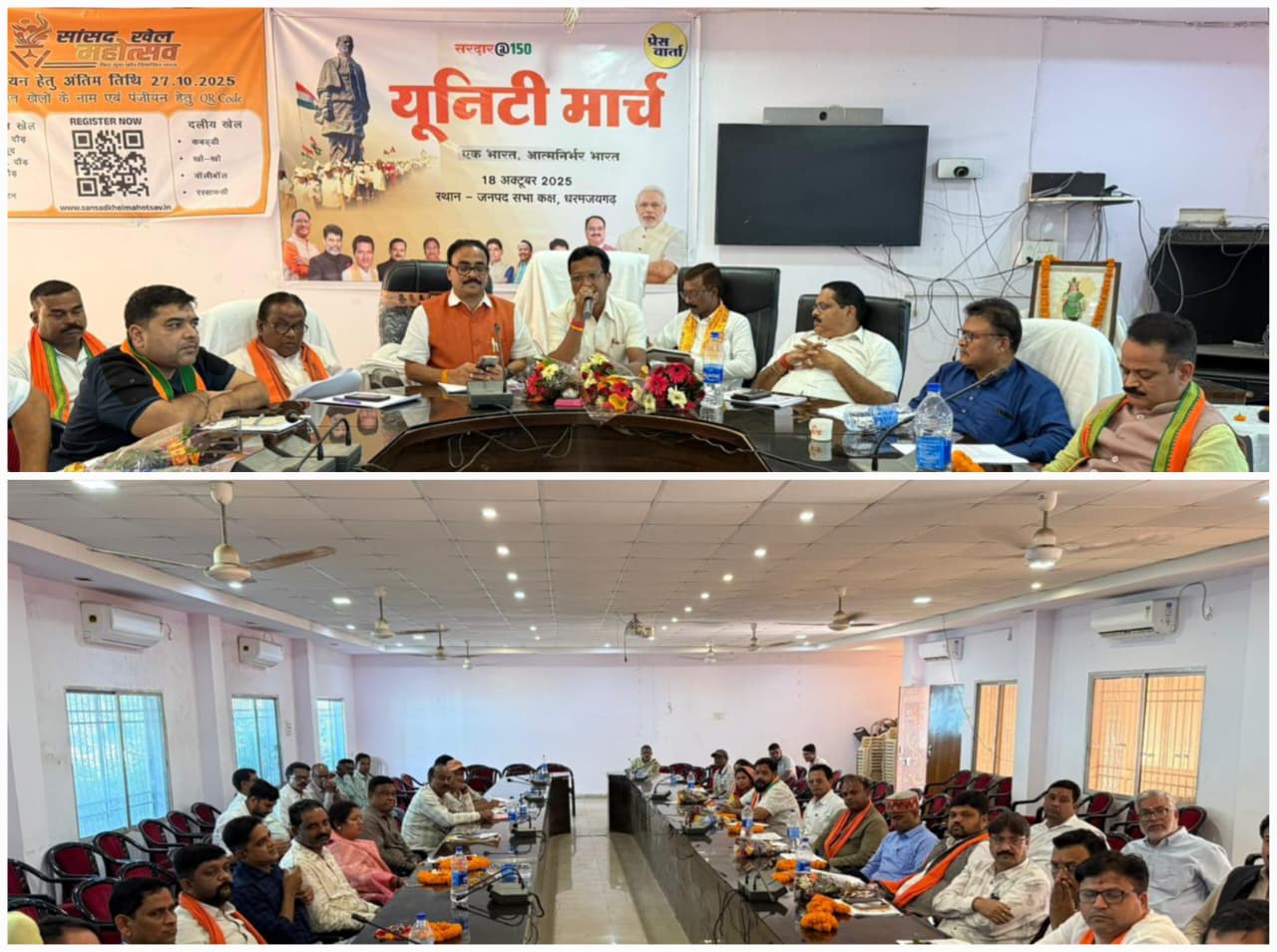 उक्त आयोजन की तैयारियों को लेकर लोकसभा सांसद श्री राधेश्याम राठिया ने आज जनपद पंचायत धरमजयगढ़ के सभाकक्ष में एक महत्वपूर्ण बैठक ली। उन्होंने आयोजन की रूपरेखा पर विस्तार से चर्चा करते हुए सभी विभागीय अधिकारियों को आवश्यक दिशा-निर्देश दिए। मौके पर सांसद श्री राठिया ने विकासखंड शिक्षा अधिकारी एवं जनपद पंचायत सीईओ को प्रत्येक विकासखंड से 5 हजार प्रतिभागियों का पंजीयन सुनिश्चित करने के निर्देश दिए। उन्होंने यह भी कहा कि पंजीयन कार्य को समय-सीमा के भीतर पूर्ण कर लिया जाए ताकि आयोजन व्यवस्थित ढंग से संपन्न हो। बैठक में नगर निगम महापौर श्री जीवर्धन चौहान भी विशेष रूप से उपस्थित रहे। आगामी रणनीति को अंतिम रूप देने हेतु सांसद श्री राठिया की अध्यक्षता में 27 अक्टूबर को शाम 5 बजे कलेक्ट्रेट सभाकक्ष में पुनः बैठक आयोजित की जाएगी।