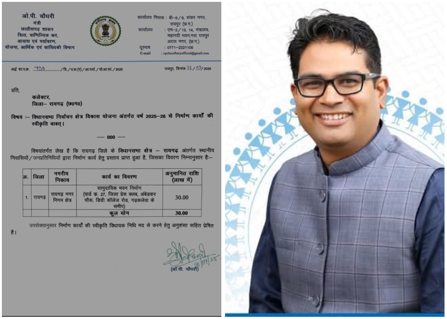 रायगढ़ :- विधायक ओपी चौधरी ने विधानसभा निर्वाचन क्षेत्र विकास योजना अंतर्गत वर्ष 2025-26 हेतु रायगढ़ नगर निगम क्षेत्र स्थित, जिला प्रेस क्लब,भवन हेतु तीस लाख स्वीकृत किए है। उपरोक्तानुसार निर्माण कार्यों की स्वीकृति विधायक निधि मद से करने हेतु अनुशंसा जिला कलेक्टर को प्रेषित कर दी गई ।