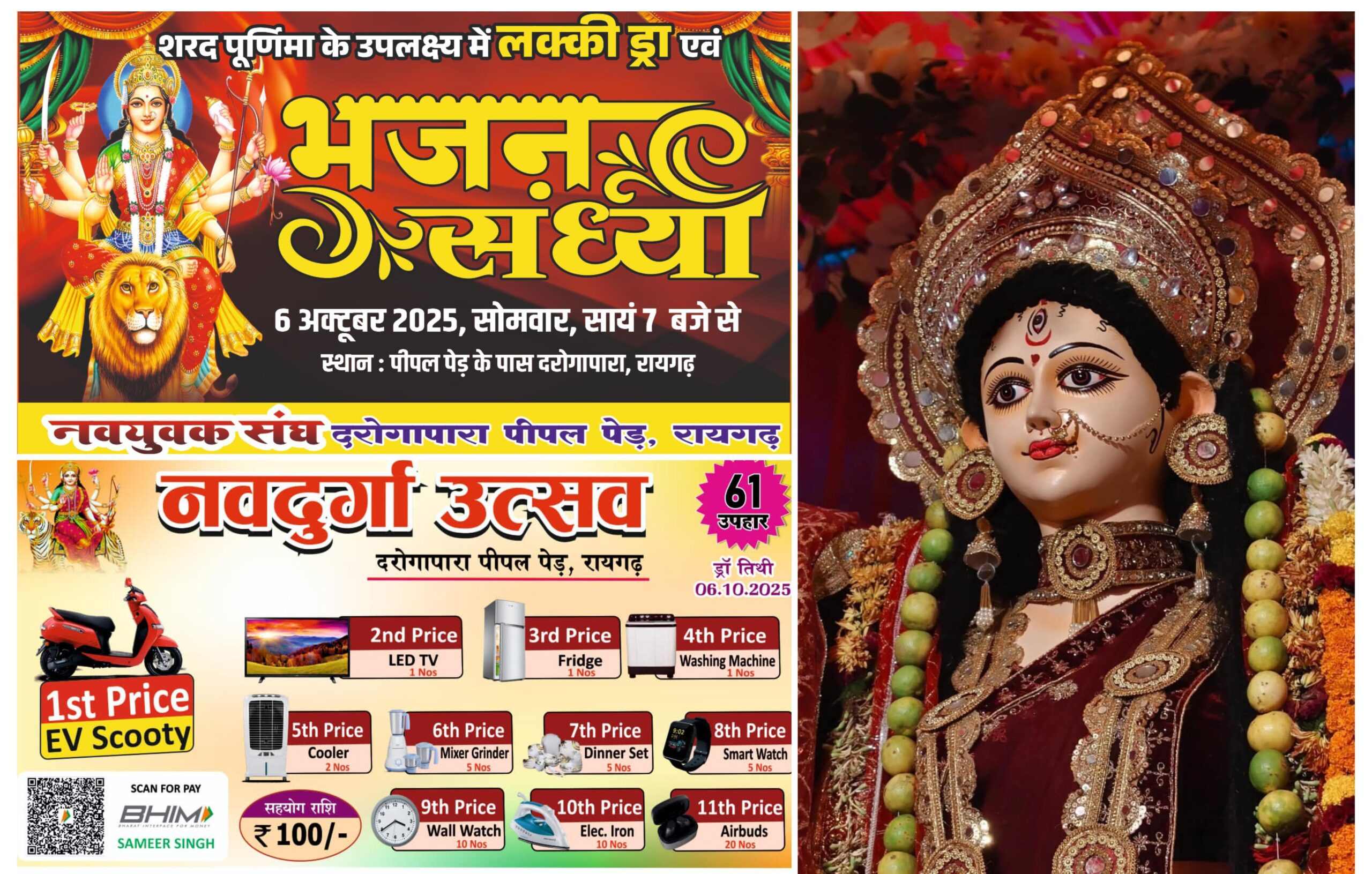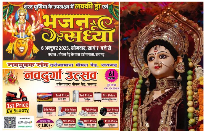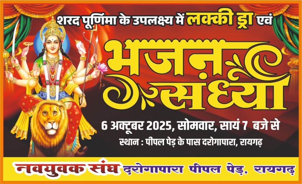रायगढ़। नवरात्र पर्व की भक्ति लहर अब भी शहर में गूंज रही है। माँ दुर्गा की भव्य आराधना और विसर्जन के बाद भी भक्तों का उत्साह कम नहीं हुआ है। इसी कड़ी में नवयुवक संघ, दरोगापारा (पीपल पेड़) आज अपने वार्षिक आयोजन की विशेष संध्या मनाने जा रही है। इस अवसर पर समिति की ओर से “भाग्यशाली विजेताओं” के नामों की भी घोषणा की जाएगी।