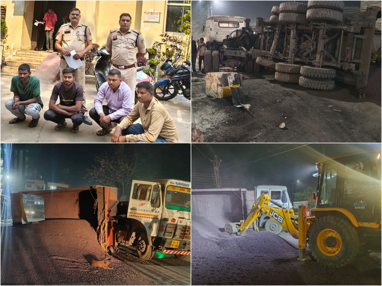 🚨 देर रात चक्रधरनगर चौंक पर पल्टी आयरन गोली ओव्हर लोड ट्रेलर वाहन, चक्रधरनगर पुलिस की त्वरित कार्रवाई, रात में ही मार्ग से हटवाया गया बिखरा आयरन पेलेट….