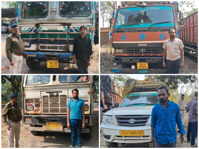 कोतवाली और साइबर थाने की टीम द्वारा पूंजीपथरा- रायगढ़ मुख्य मार्ग में उर्दना के पास नाकेबंदी कर 6 वाहनों को पकड़ा है जिसमें माजदा वाहन CG 13 AP 2652 (5 टन), 10 चक्का ट्रक OR 09 L 0175 (30 टन), पिकअप CG 13 AR 5783 (1.5 टन), माजदा वाहन OD 15 V 7853 (6 टन्), माजदा वाहन CG 13 AR 7550 (8 टन्), टाटा 14 चक्का OD 15 H 9541 (22 टन) स्कैप लोड पाया गया ।
