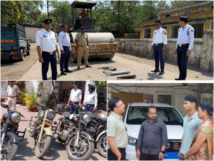 बुलेट के पटाखों पर चला पुलिस का रोड रोलर: 11 वाहन पकड़े गए, 50 मॉडिफाइड साइलेंसरों का काम तमाम, अभिभावकों को बुलाकर दी गई कड़ी समझाइश…
