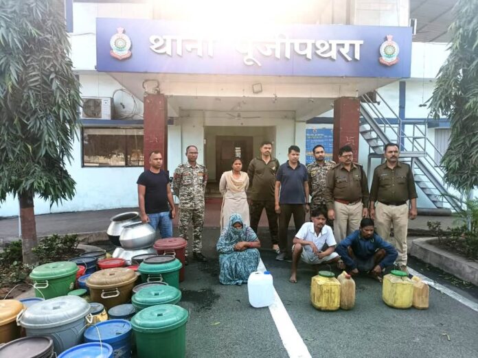 रायगढ़, 2 फरवरी । पुलिस अधीक्षक दिव्यांग कुमार पटेल के निर्देशन में थाना पूंजीपथरा क्षेत्र में अवैध शराब के खिलाफ आज अभियान स्तर पर कार्रवाई की गई। डीएसपी अनिल विश्वकर्मा के मार्गदर्शन और थाना प्रभारी निरीक्षक राकेश मिश्रा के नेतृत्व में पुलिस टीम ने तराईमाल इलाके में छापेमारी कर अवैध रूप से शराब बनाने और बेचने वालों की सूचनाएं ली और तस्दीकी केलिए छापेमारी किया गया । पुलिस को तराईमाल के तीन ठिकानों में अवैध शराब के साथ मिले तीन आरोपियों को गिरफ्तार किया। कार्रवाई में कुल 52 लीटर महुआ शराब जब्त की गई, जिसकी कीमत 5,200 रुपये है।