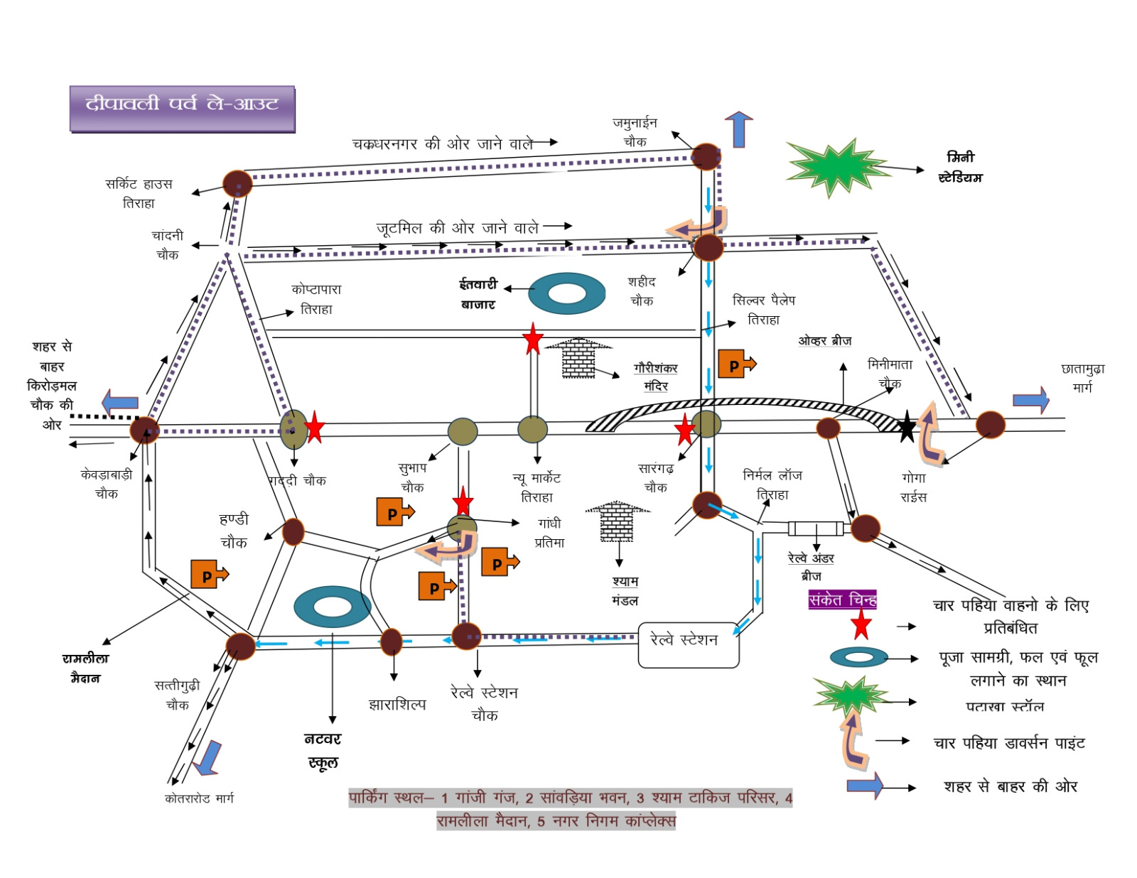 भीड़ नियंत्रण के लिए निम्न स्थानों पर डायवर्जन व्यवस्था लागू की जाएगी: