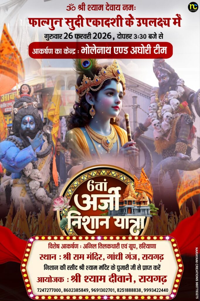 रायगढ़। सांस्कृतिक राजधानी रायगढ़ की धरा एक बार फिर श्याम रंग में सराबोर होने के लिए पूरी तरह तैयार है। फाल्गुन सुदी एकादशी के पावन उपलक्ष्य में आगामी 26 फरवरी 2026, गुरुवार को शहर में भव्य ‘6वीं अर्जी निशान यात्रा’ का आयोजन किया जा रहा है। श्री श्याम दीवाने परिवार, रायगढ़ के तत्वावधान में आयोजित होने वाली इस विशाल पदयात्रा को लेकर श्रद्धालुओं में अभूतपूर्व उत्साह देखा जा रहा है। आयोजन की भव्यता का अंदाजा इसी बात से लगाया जा सकता है कि पूरे शहर को श्याममय बनाने की तैयारियां युद्धस्तर पर जारी हैं।