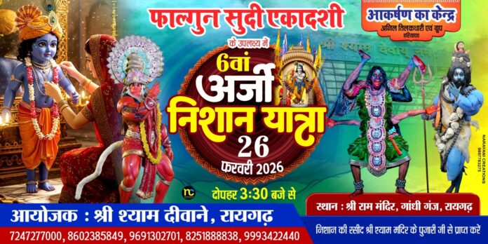 रायगढ़। सांस्कृतिक राजधानी रायगढ़ की धरा एक बार फिर श्याम रंग में सराबोर होने के लिए पूरी तरह तैयार है। फाल्गुन सुदी एकादशी के पावन उपलक्ष्य में आगामी 26 फरवरी 2026, गुरुवार को शहर में भव्य ‘6वीं अर्जी निशान यात्रा’ का आयोजन किया जा रहा है। श्री श्याम दीवाने परिवार, रायगढ़ के तत्वावधान में आयोजित होने वाली इस विशाल पदयात्रा को लेकर श्रद्धालुओं में अभूतपूर्व उत्साह देखा जा रहा है। आयोजन की भव्यता का अंदाजा इसी बात से लगाया जा सकता है कि पूरे शहर को श्याममय बनाने की तैयारियां युद्धस्तर पर जारी हैं।