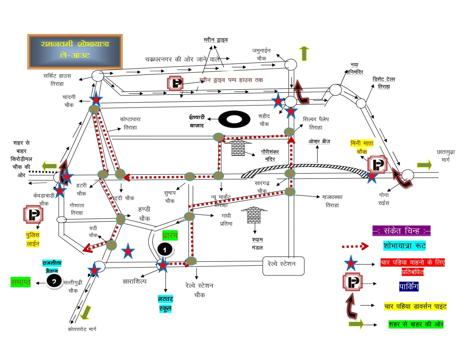 1 किरोड़ीमल चौक की ओर से आने वाली यातायात शोभायात्रा प्रारंभ होने के 02 घंटे पूर्व केवड़ाबाड़ी चौक से मधुबनपारा मार्ग से सर्किट हाउस एवं मरीन ड्राइव का उपयोग कर नया शनिमंदिर, डिसेंट टेलर तिराहा होकर गंतव्य को जा सकते है। इसी प्रकार