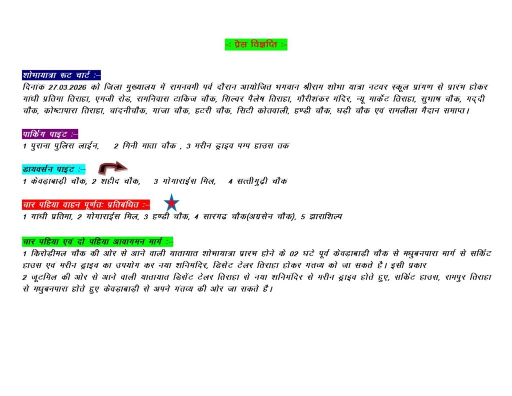 शोभायात्रा रूट चार्ट: दिनांक 27.03 2026 को जिला मुख्यालय में रामनवमी पर्व दौरान आयोजित भगवान श्रीराम शोभा यात्रा नटवर स्कूल प्रांगण से प्रारंभ होकर गांधी प्रतिमा तिराहा, एमजी रोड, रामनिवास टाकिज चौक, सिल्वर पैलेष तिराहा, गौरीशंकर मंदिर, न्यू मार्केट तिराहा, सुभाष चौक, गद्दी चौक, कोष्टापारा तिराहा, चांदनीचौक, गांजा चौक, हटरी चौक, सिटी कोतवाली, हण्डी चौक, घड़ी चौक एवं रामलीला मैदान समाप्त।