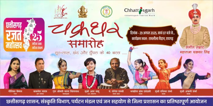 रायगढ़। रायगढ़ में चल रहे 40वें चक्रधर समारोह के तृतीय दिवस, 29 अगस्त को विविध सांस्कृतिक प्रस्तुतियाँ आयोजित की जाएंगी। इस दिन संस्कृत गायन एवं मंचन, श्री गणेश स्तुति, कथक, नृत्य-नाटिका, भरतनाट्यम, तबला वादन और छत्तीसगढ़ी लोकगीत की सुंदर प्रस्तुतियाँ दर्शकों को देखने को मिलेंगी।