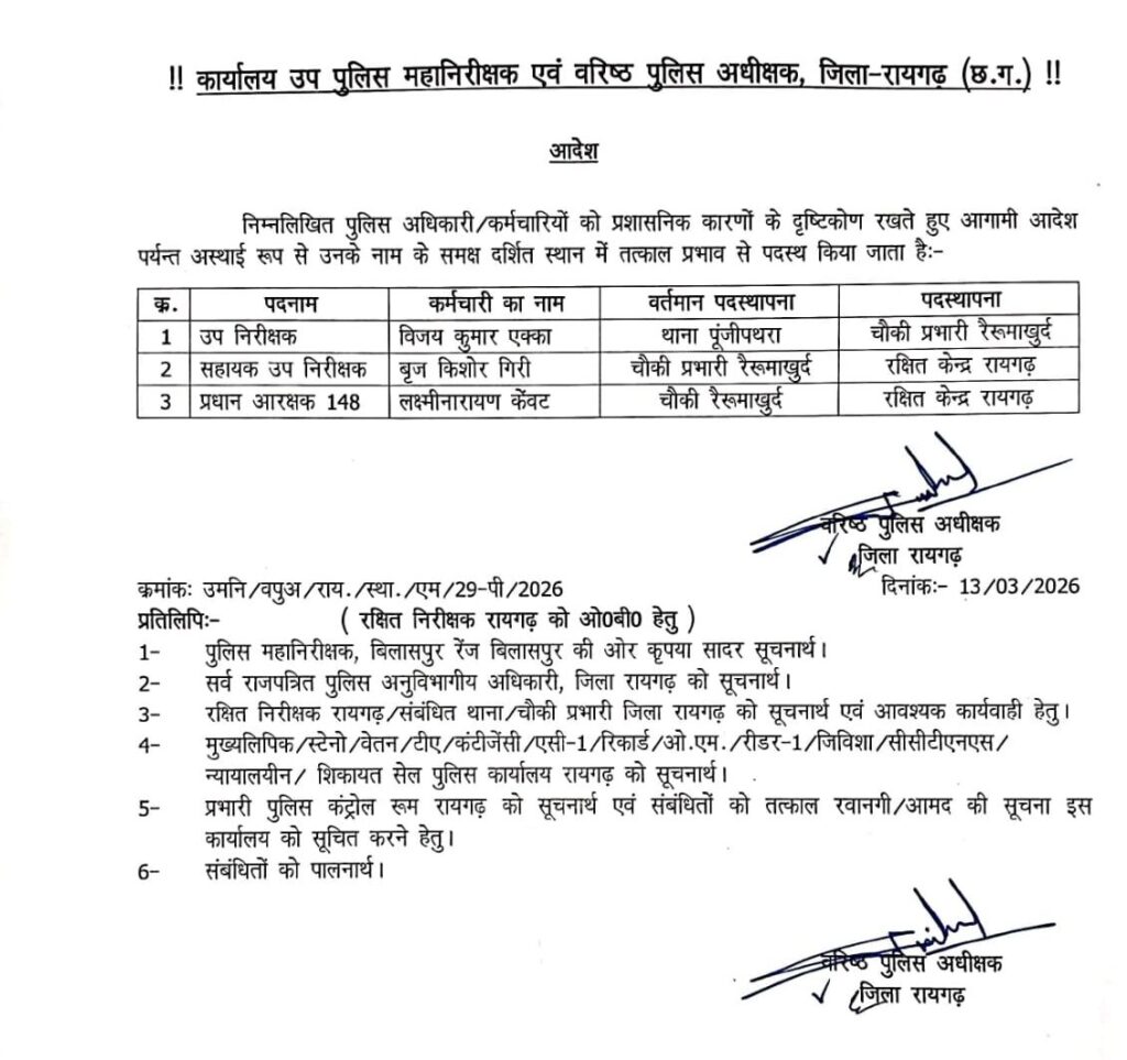 साथ ही थाना पूंजीपथरा में पदस्थ उपनिरीक्षक विजय एक्का को चौकी रैरूमाखुर्द प्रभारी बनाया गया है।