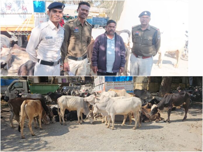 आरोपी के कब्जे से 32 नग गौवंश, जिनकी अनुमानित कीमत 2,56,000 रुपये है, बरामद कर मुक्त कराया गया। पूछताछ में आरोपी ने मवेशियों को बुचड़खाने की ओर ले जाना स्वीकार किया। मुक्त कराए गए मवेशियों का पशु चिकित्सक से परीक्षण कराया गया तथा उन्हें सुरक्षित रूप से सलखिया गौशाला में रखने की व्यवस्था की गई। आरोपी के विरुद्ध थाना लैलूंगा में अपराध क्रमांक 41/2026 के तहत धारा 4, 6, 10, 11 छत्तीसगढ़ पशु परिरक्षण अधिनियम 2004 के अंतर्गत मामला पंजीबद्ध कर उसे न्यायिक रिमांड पर भेजा गया है।