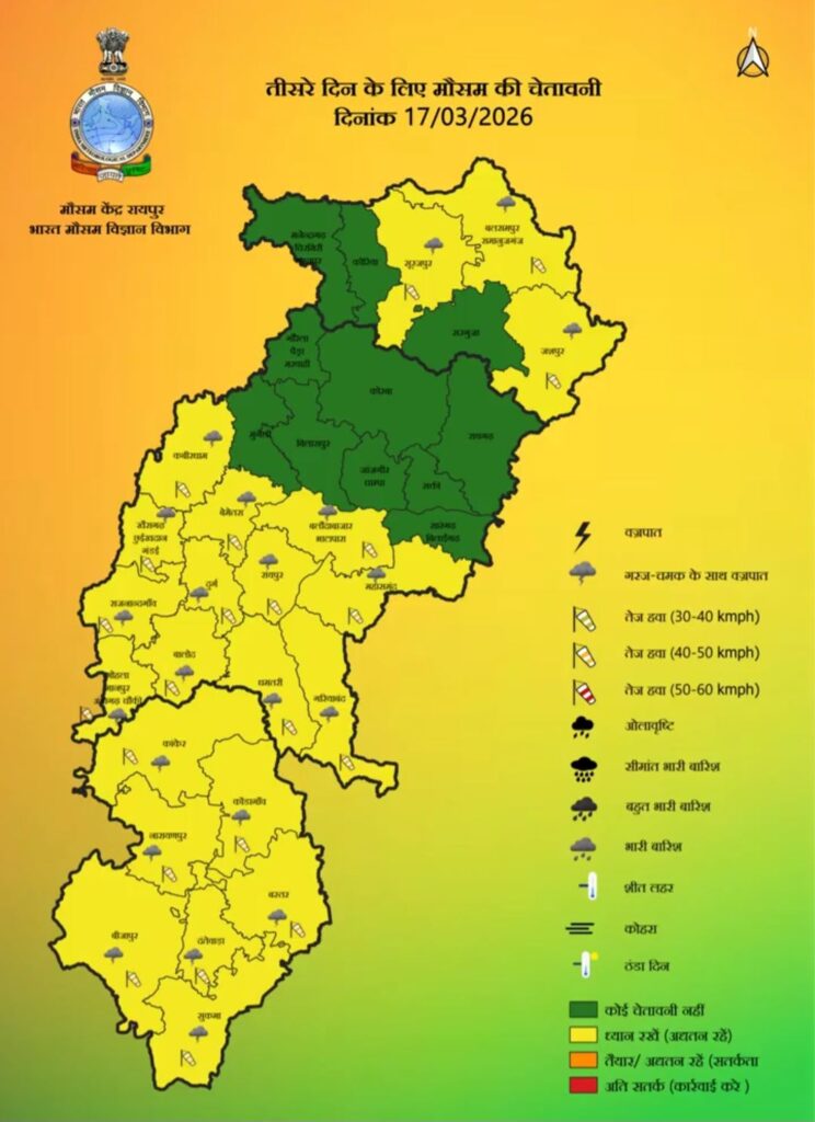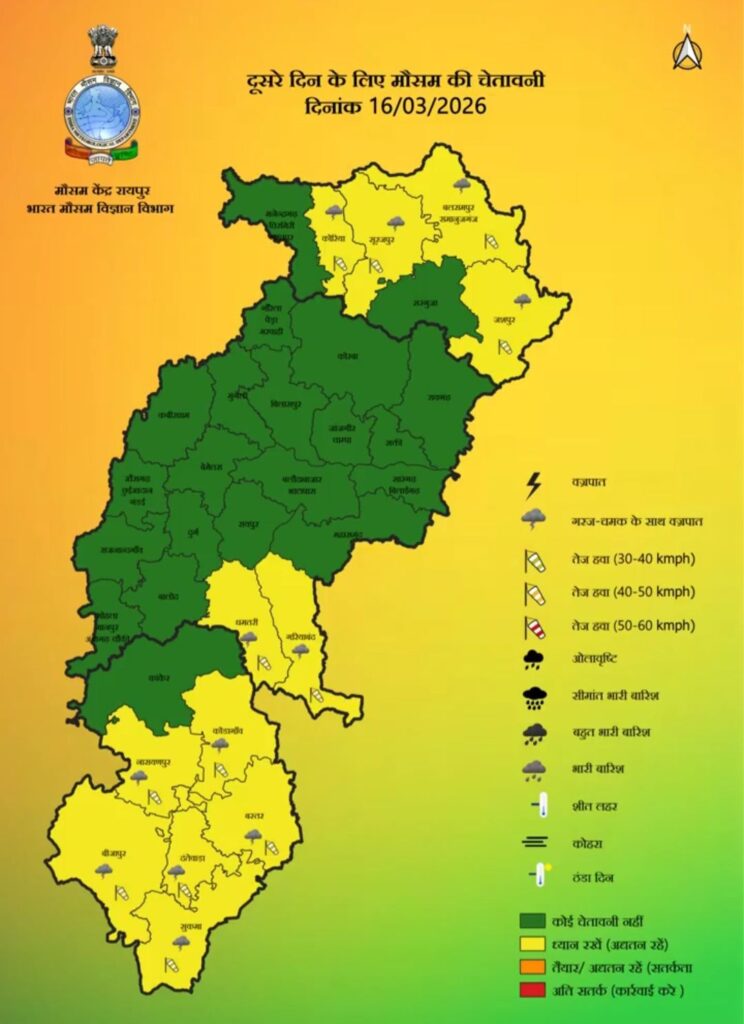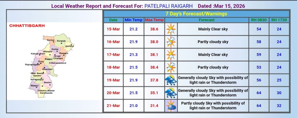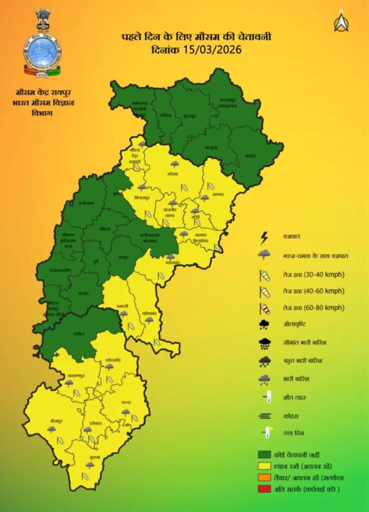 मौसम विभाग ने 15-16 मार्च को दक्षिण और मध्य छत्तीसगढ़ के कुछ क्षेत्रों में हल्की बारिश और गरज-चमक की संभावना जताई है। इसके साथ ही कुछ स्थानों पर बिजली गिरने की आशंका भी व्यक्त की गई है, इसलिए लोगों को सावधानी बरतने की सलाह दी गई है।
